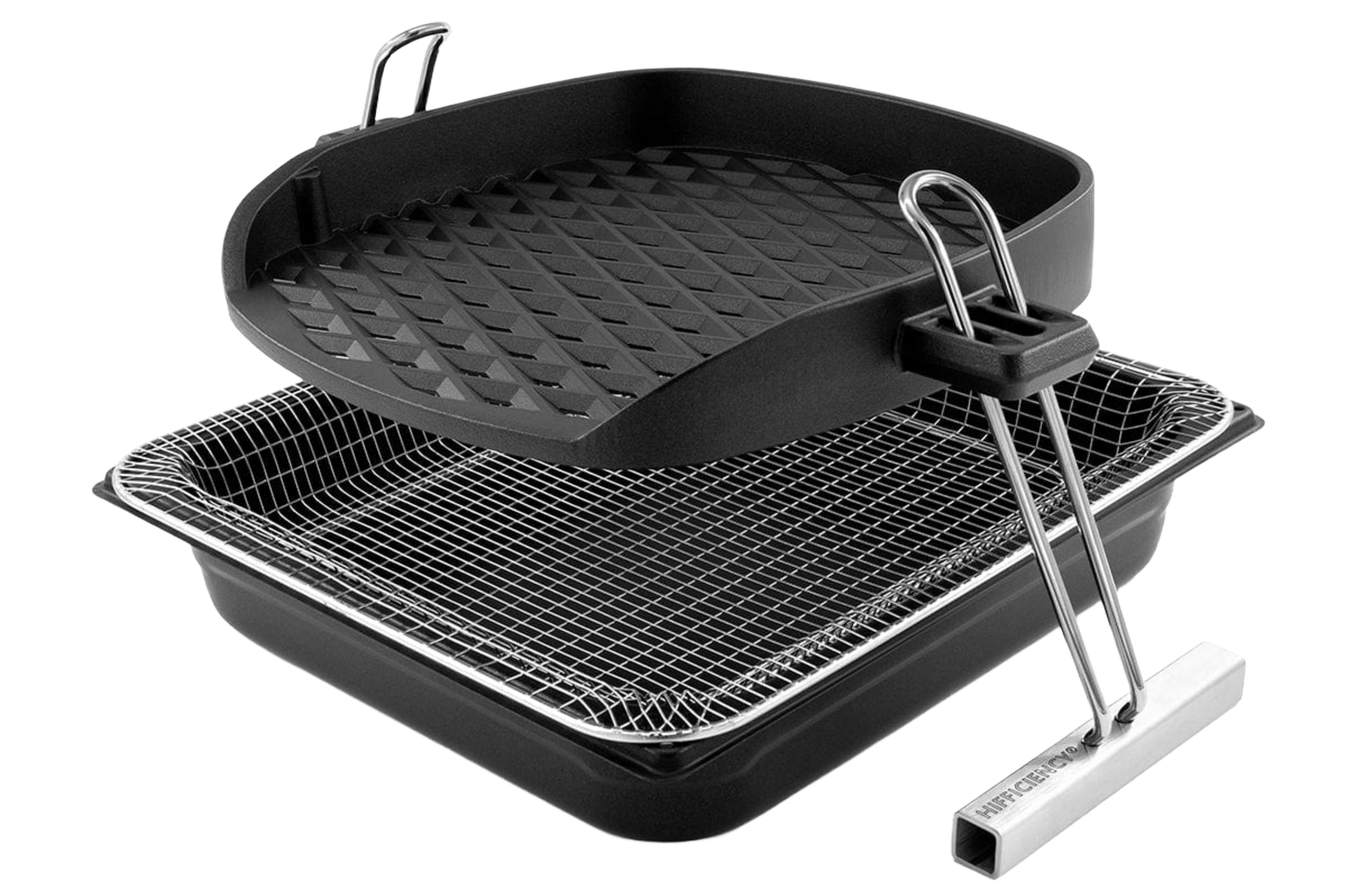 Ein kompakter Grill für auf den Tisch, der wie ein großer Profigrill grillt. Das Set besteht aus unserem X-Cook® Grillbehälter, der Multispeed® Grillrostpfanne und dem passenden Grillrost Pfannendeckel mit Edelstahlgriff. Der Clou an diesem Set: Sie können die Produkte auch einzeln benutzen.